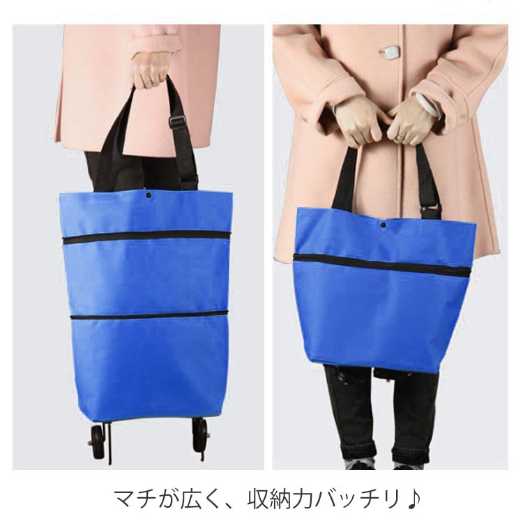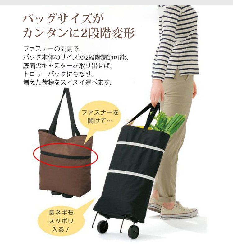 【折り畳み式トロリーバッグ】トートバッグがカートに変身!ファスナーの開閉で、バッグ本体のサイズが2段階調節可能。